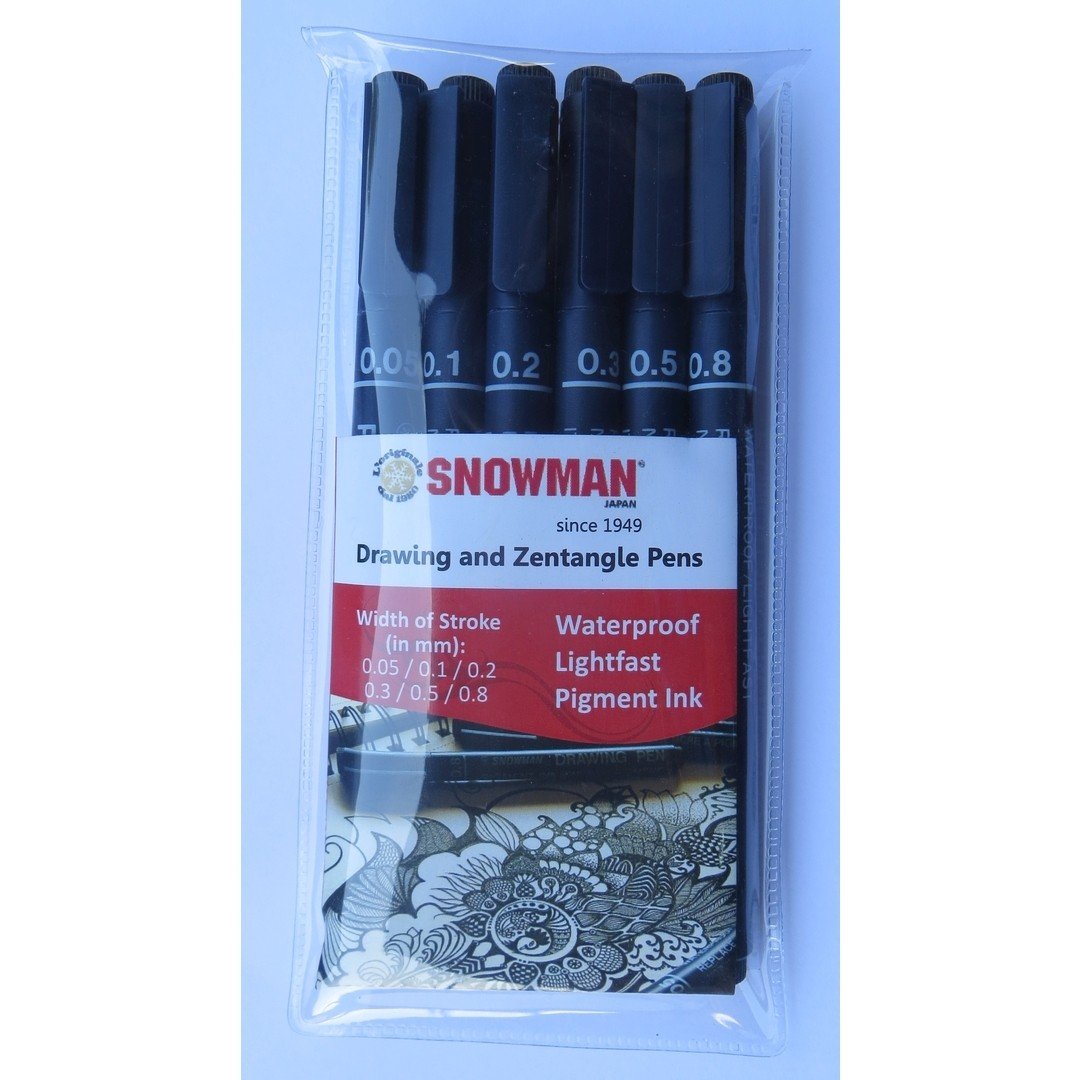 Artists, writers, graphic artists and illustrators opt for the Snowman Drawing Pens to bring their art work to life. The Snowman Drawing pens allow them to express their personality, style, and ability. The lasting quality of Snowman ink ensures that your artwork is safeguarded. Snowman Drawing pens are lightfast and waterproof, making them ideal for use in paper crafts, journals, illustration, crafts, or any application requiring precision and permanence. Snowman Drawing Pens make it easy to produce attractive illustrations, hairline sketches and fine characters. Snowman Drawing pen tips are designed for precision work. Unlike flexible nibs or brushes, each pen creates a consistent and predictable line width. Featuring pigment based ink Snowman Drawing Pens will not feather or bleed even through thin papers. Colour consistency is ensured due to the high quality of pigment used to manufacture the Snowman Ink, and is fade proof against sunlight or UV light. Snowman inks will not clog or dry out. Applications include: Doodling, Archival journals, Illustrations, Manga, Anime & Cartoon Design, Graphic Art and Design, Automobile Design, Architecture, Zentangle, Legal documents, log books, checks, sketching with watercolours, Rubber stamping and Scrapbooking Snowman's quality artist pens meet the following criteria: • fade-resistant / lightfast • smudge-proof • water-proof • bleed-proof • pigment ink • Made in Japan Pens are not refillable. Set of 6 Colour: Black Width of Line Stroke:0.05mm, 0.1mm, 0.2mm, 0.3mm, 0.5mm, 0.8mm